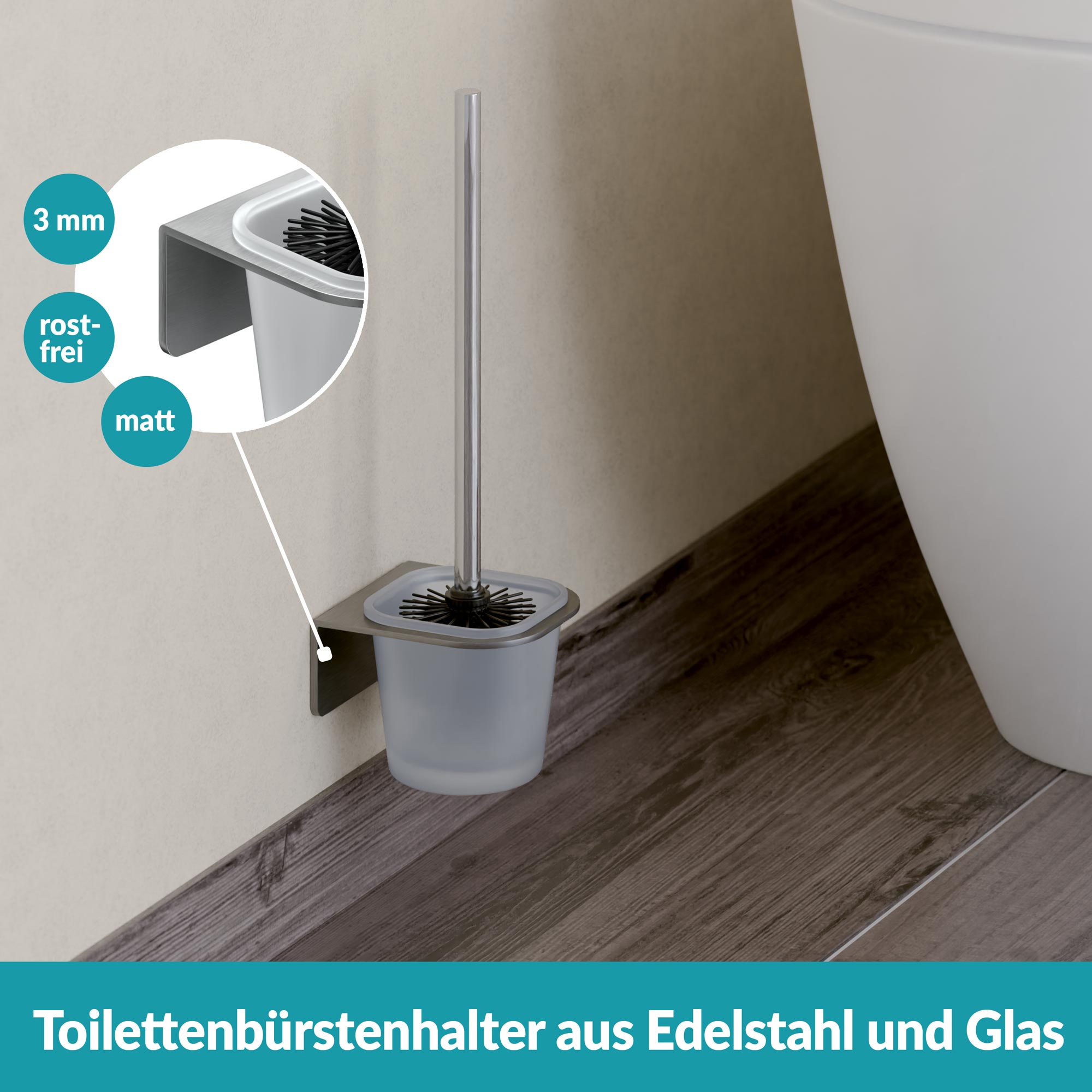 Toilettenbürstenhalter ohne Bohren als Set- bestehend aus einem Toilettenbürstenhalter aus Glas inkl. Halterung aus schwarz pulverbeschichtetem, rostfreiem Edelstahl und einer schwarzen Silikon-Toilettenbürste